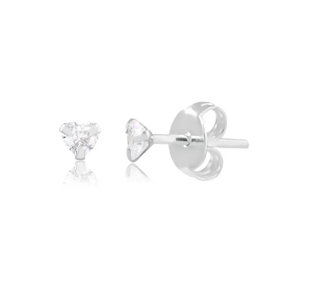 Brinco de prata e zircônia cristal em formato de coração, medindo 4mm de altura e 4mm de largura. Produto em prata 925, ideal para você revendedora.