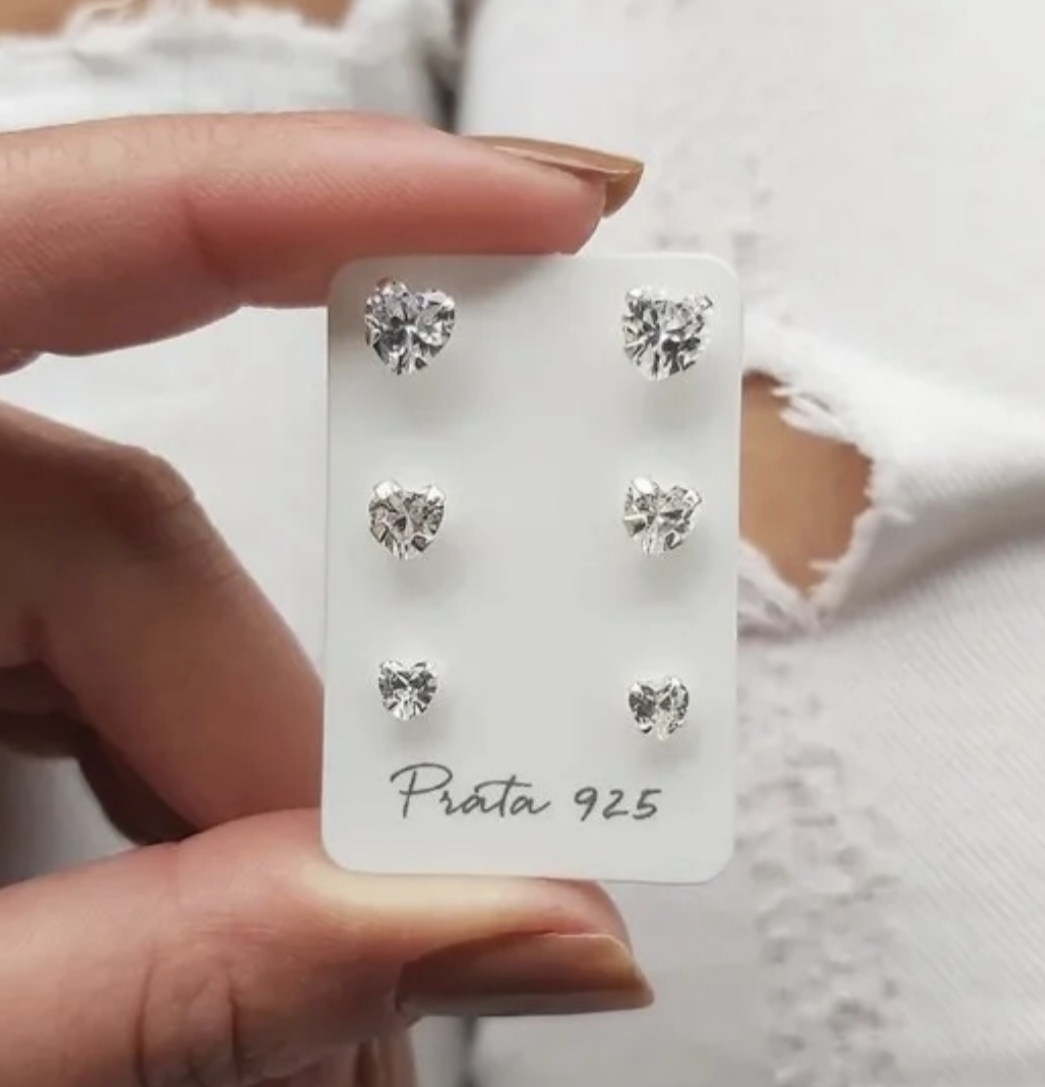Trio de brincos prata com zircônia em formato de coração, com tamanho de brinco grande, médio e pequeno. Brinco grande: 5mm de diâmetro Brinco médio: 4mm de diâmetro Brinco pequeno: 3mm de diâmetro Produtos em prata 925, ideal para você revendedora.