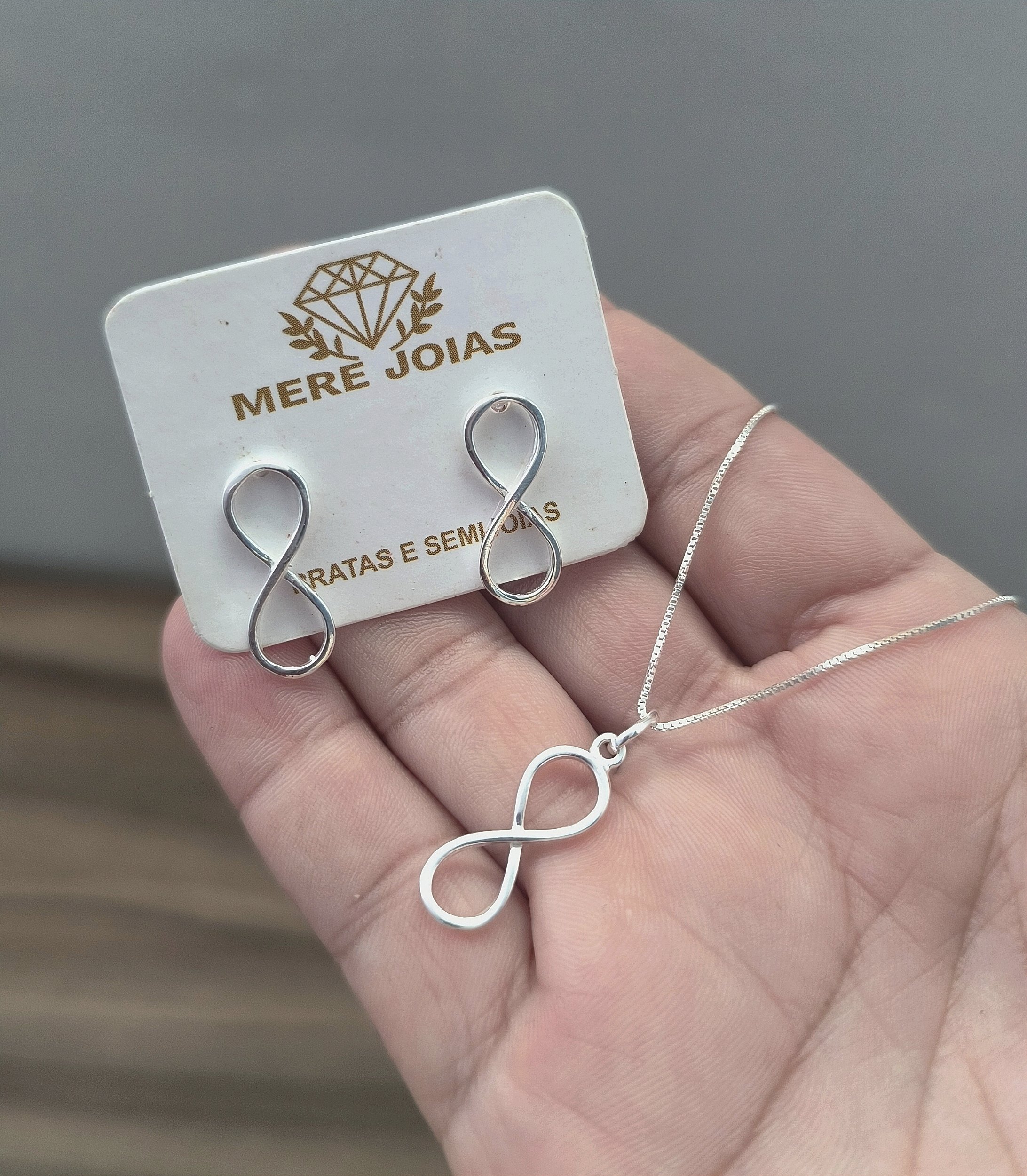 O conjunto inclui 1 colar com pingente símbolo do infinito e 1 par de brincos com o mesmo design, todos em prata 925, prontos para uso ou presente.