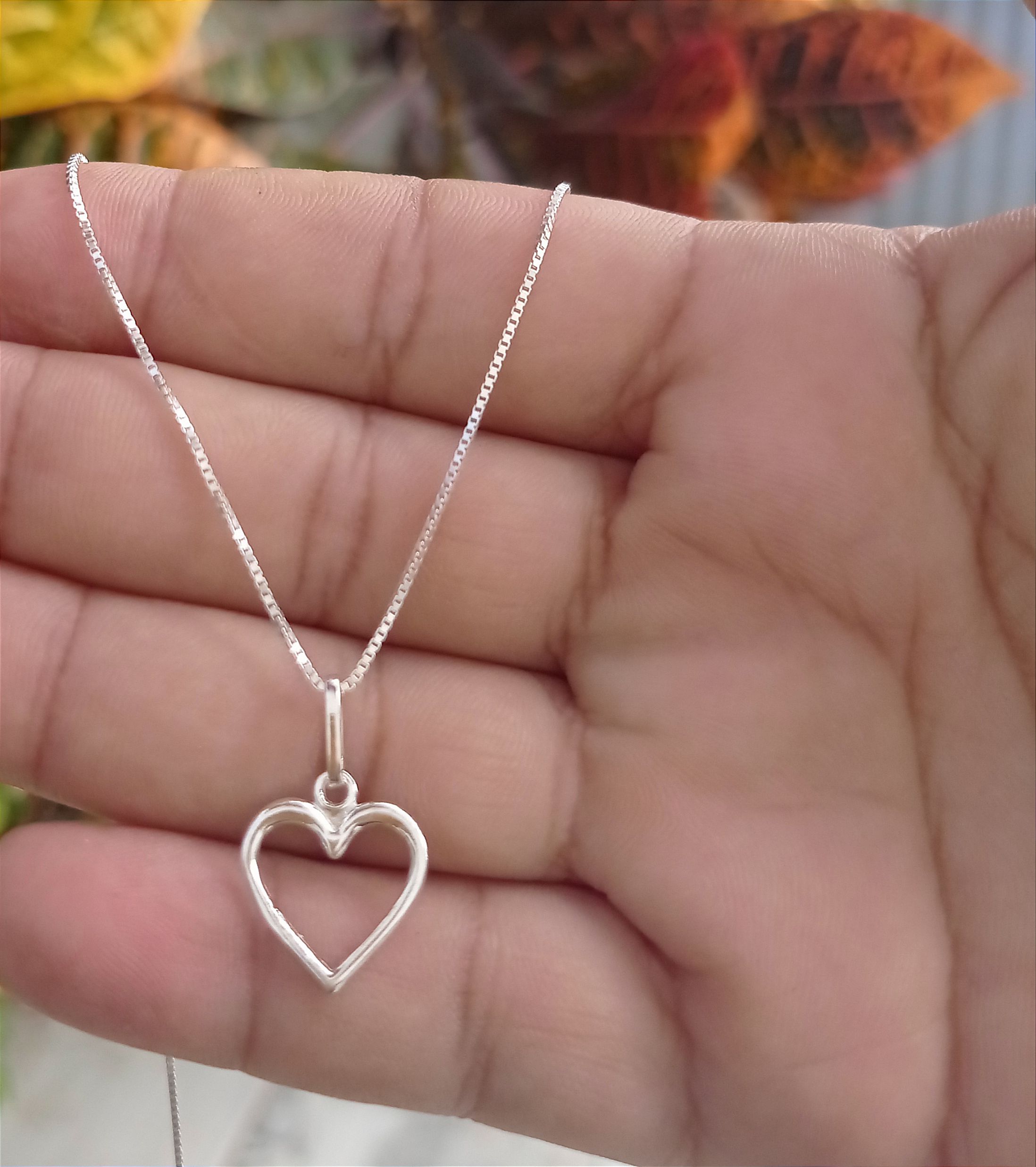 Colar com pingente de coração simples vazado, medindo com corrente veneziana v15, medindo 45cm. Pingente medindo 2,1cm de altura e 1,3cm de largura. Produto em prata 925, ideal para você revendedora.