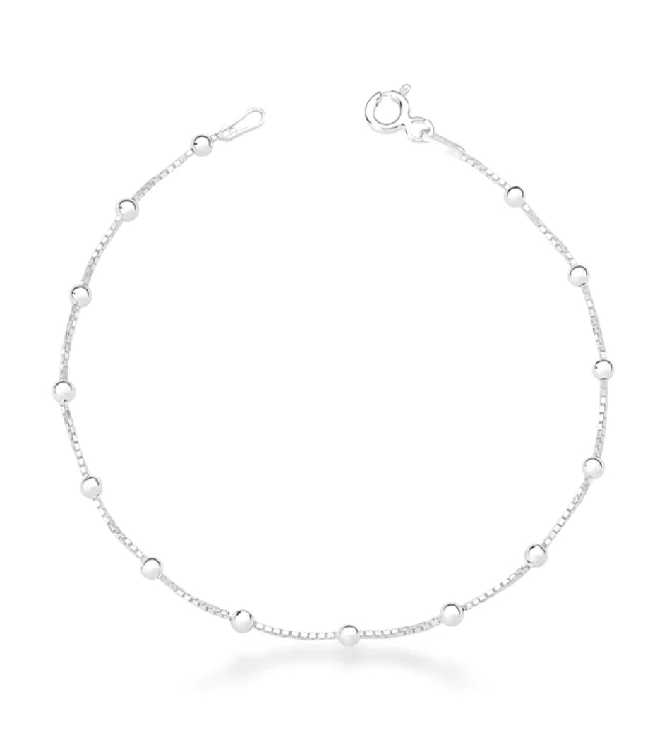 Esta pulseira é feita em prata 925, garantindo brilho e durabilidade. Sua corrente em estilo veneziano é fina e delicada, com bolinhas lisas distribuídas ao longo do comprimento. O fecho é do tipo mola, que facilita a colocação e mantém a peça firme no pulso. O visual minimalista combina com diferentes estilos e ocasiões.